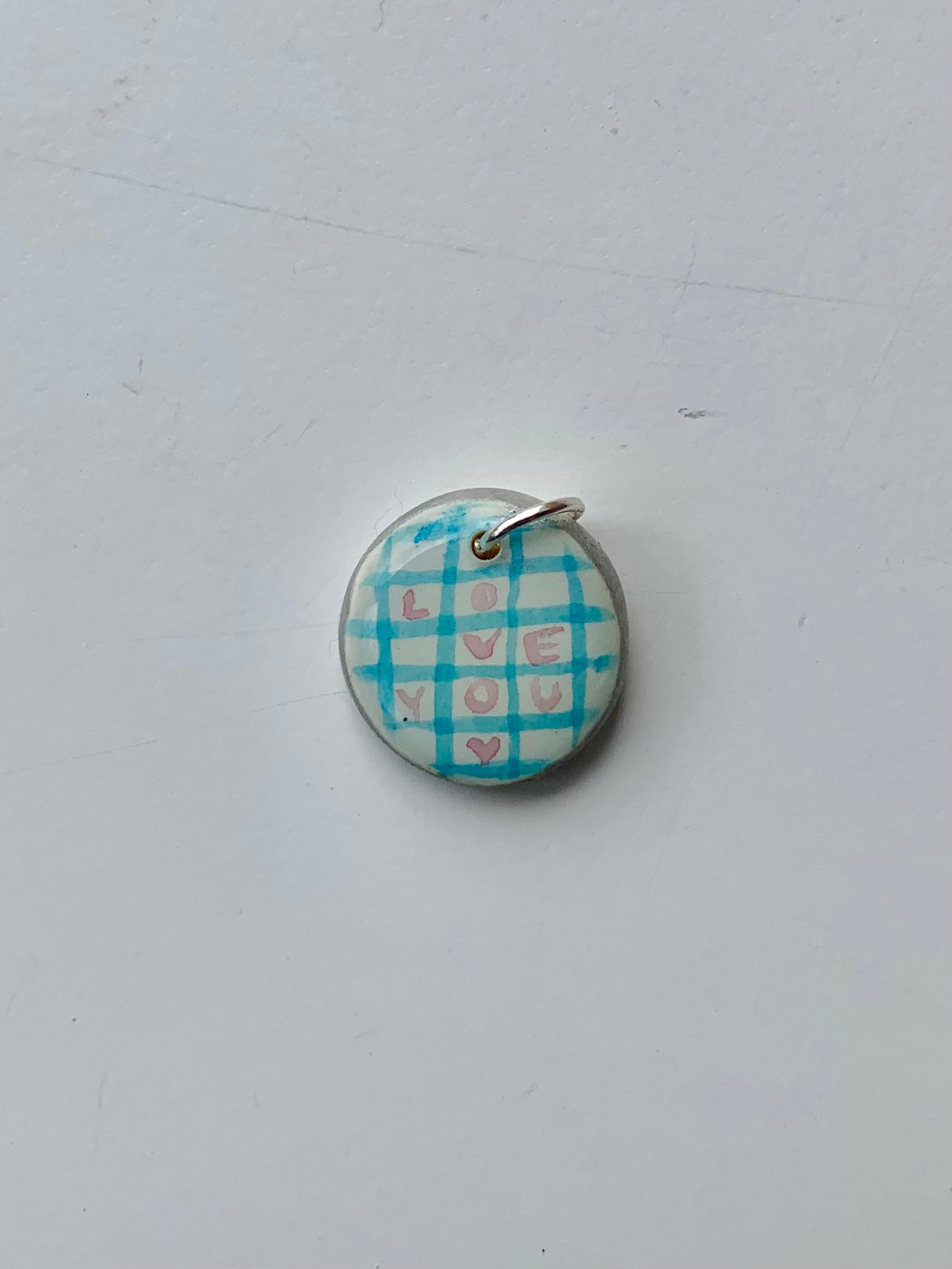 Este colgante está pintado a mano y mide 2cm largo por 2cm de ancho aprox.